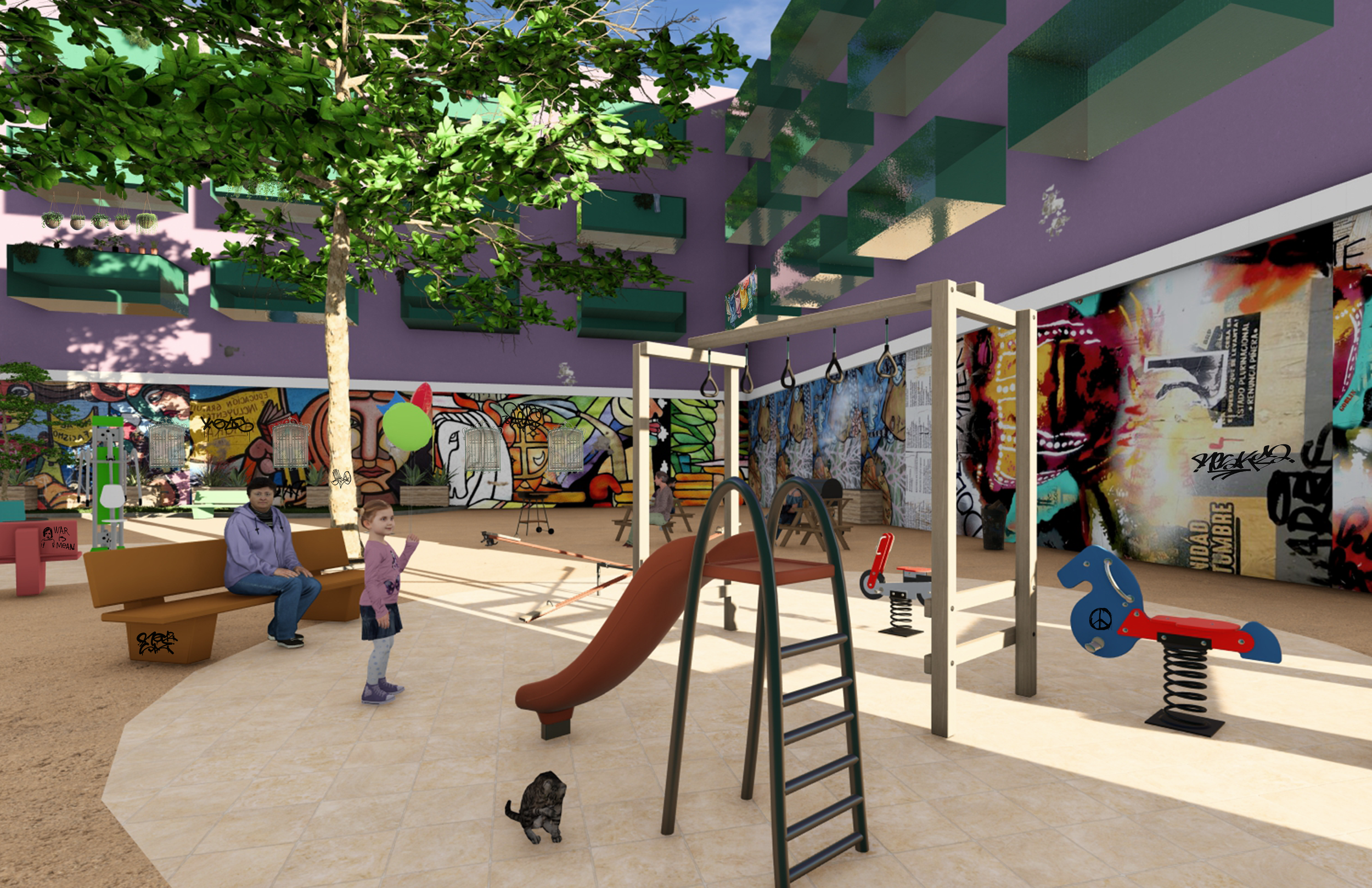 As part of a collaborative studio in Santiago, our team worked with the federal government of Chile to reimagine an industrial area into a vibrant network of public spaces. We proposed a system of interconnected courtyards that transition from private to semi-public to fully public, creating a layered urban fabric that fosters community and inclusivity. My role focused on developing the visualizations that communicate the spatial qualities and emotional experience of moving through each courtyard—capturing how these spaces feel to inhabit as well as how they connect as a larger system.
